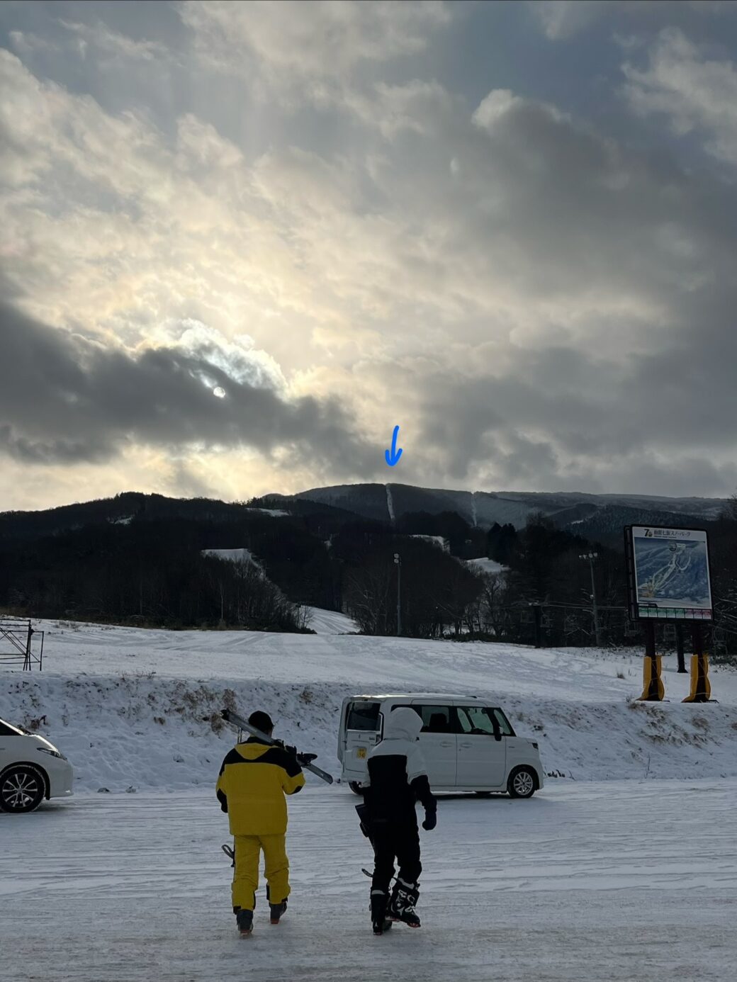 青の矢印の所までゴンドラで登ります