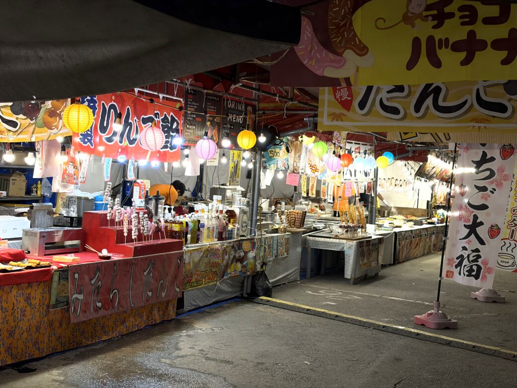 焼きそばや焼き鳥の屋台が並ぶ中