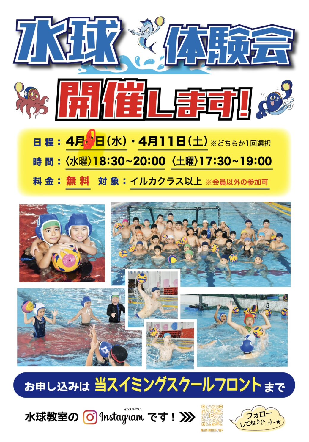 4月8日(水)・11日(土)で水球教室体験会を開催します👍